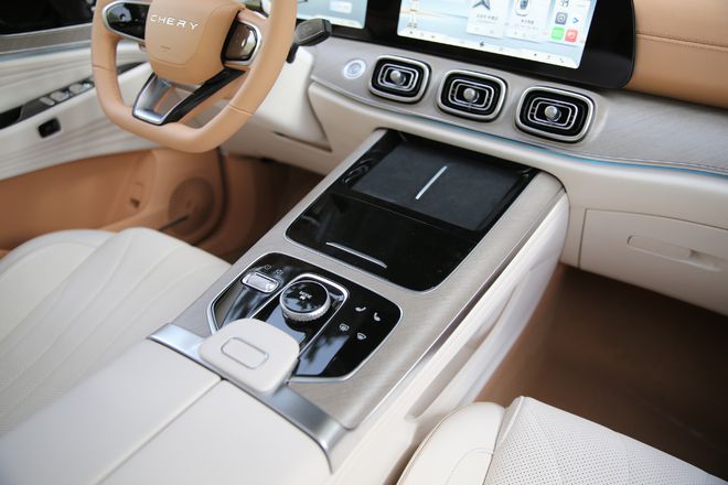 瑞虎9換成了懷擋,所以中央通道就變得更加整潔了,50W手機無線快充和水杯架以及少量的可觸摸按鍵被合理布局在這里。