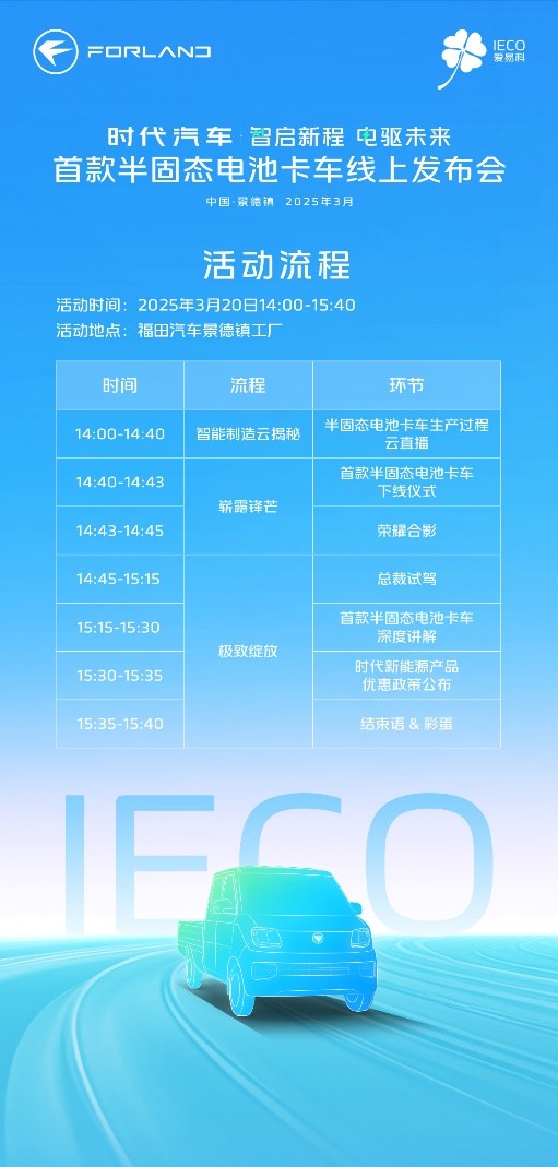 3月20日,以“智啟新程·電驅未來”為主題的時代汽車首款半固態(tài)電池卡車線上發(fā)布會,將在福田汽車景德鎮(zhèn)工廠驚喜開場,全程直播,云揭秘半固態(tài)電池卡車在總裝車間從376個零部件歷經135道工序到一臺整車的智能制造全過程。每個環(huán)節(jié)都凝聚著時代汽車科技與匠心,關注直播帶您解鎖這場技術盛宴。同時,時代汽車總裁將親臨現場,化身“性能體驗官”,親自駕馭首款半固態(tài)電池卡車,以第一視角帶領觀眾沉浸式感受其卓越性能。