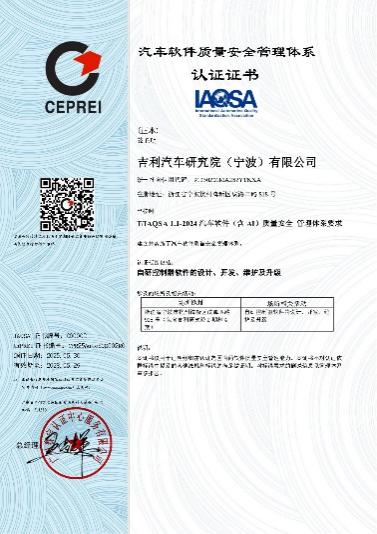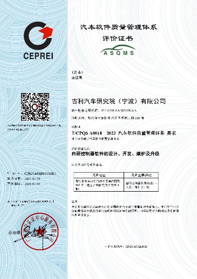 2025年6月23日,由賽寶認(rèn)證中心向吉利汽車研究院授予的“汽車軟件質(zhì)量管理體系標(biāo)準(zhǔn)(ASQMS)”和“汽車軟件(含 AI)質(zhì)量安全管理標(biāo)準(zhǔn)(AUTOSQS)”證書頒發(fā)儀式在寧波杭州灣吉利汽車研究院舉行。