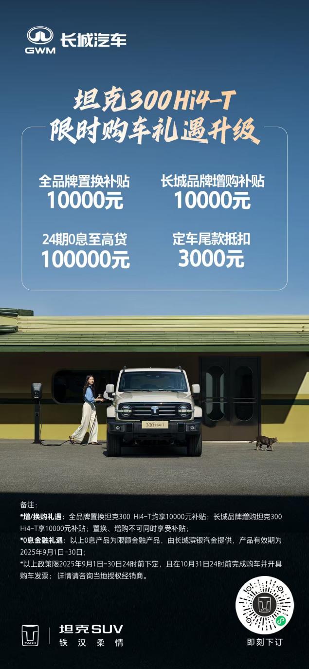 坦克300 Hi4-T憑借其經(jīng)典方盒子造型、強悍越野性能與豪華智能配置的完美融合,不僅贏得了眾多越野愛好者的青睞,更成為都市潮流人群彰顯個性的時尚座駕。為滿足廣大用戶需求,九月訂購坦克300 Hi4-T,可享以下超值權(quán)益: