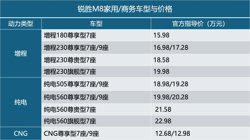 銳勝M8目前提供增程、純電和CNG三種動力模式。