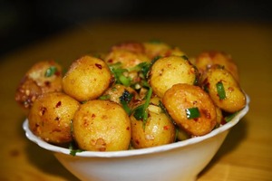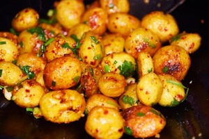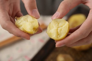 由于皮太薄,出鍋的土豆一個個都“齜牙咧嘴”。對半掰開一個,里面的薯肉是淡黃色的,質地像綠豆糕般細嫩,散發著淡淡的香氣。