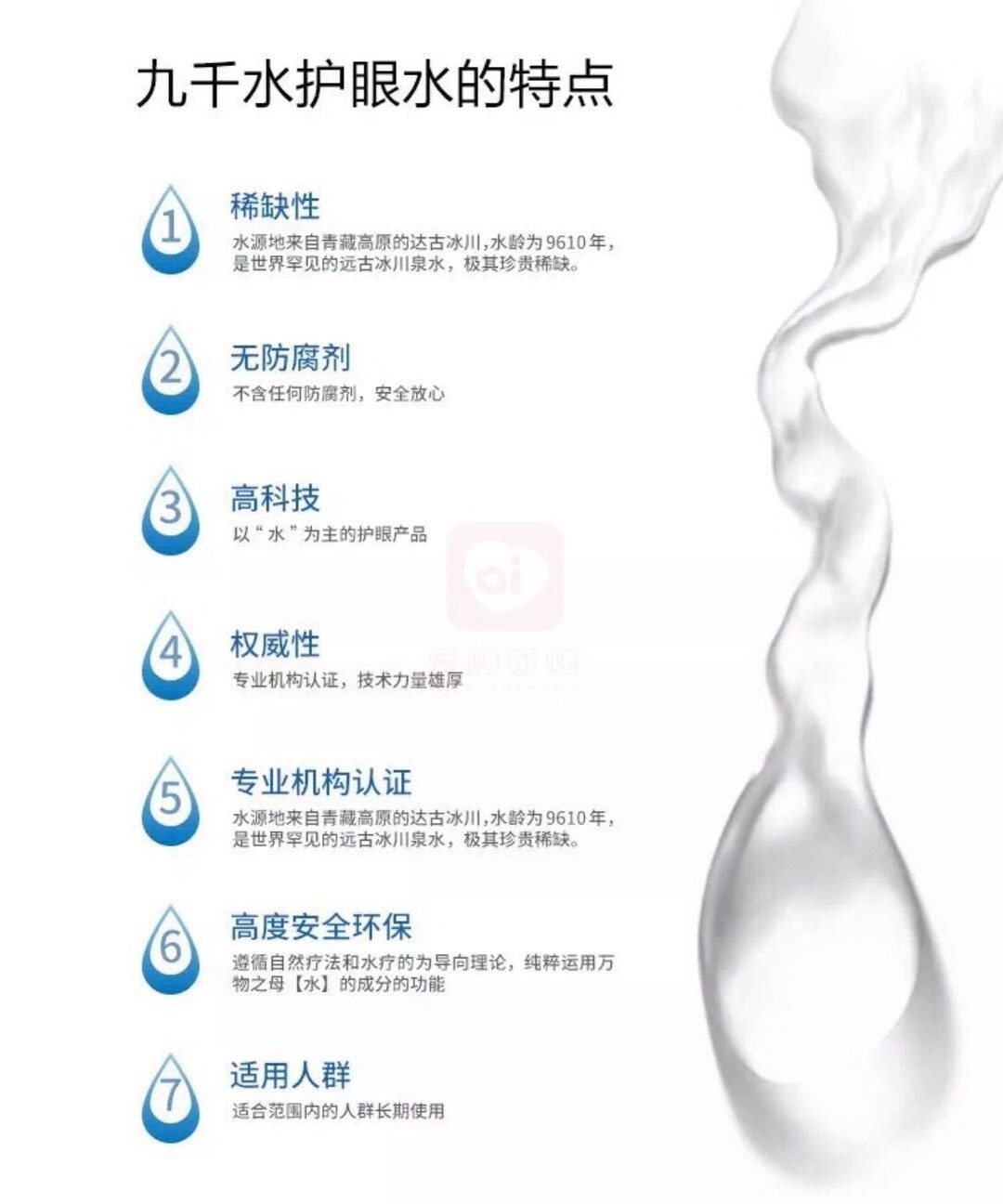 九千水護眼水產品特點:①稀缺性:水源地來自青藏高原的達古冰川,水齡為9610年,是世界罕見的遠古冰川泉水,極其珍貴稀缺。②高效性?:使用半小時顯效,絕大部分都在2-3月達到理想好效果。?③權威性?:陜衛消證字【2014】第0186號?與CMA第三方質檢④高度安全環保?:純粹運用萬物之母【水】的成分的功能修復細胞功能