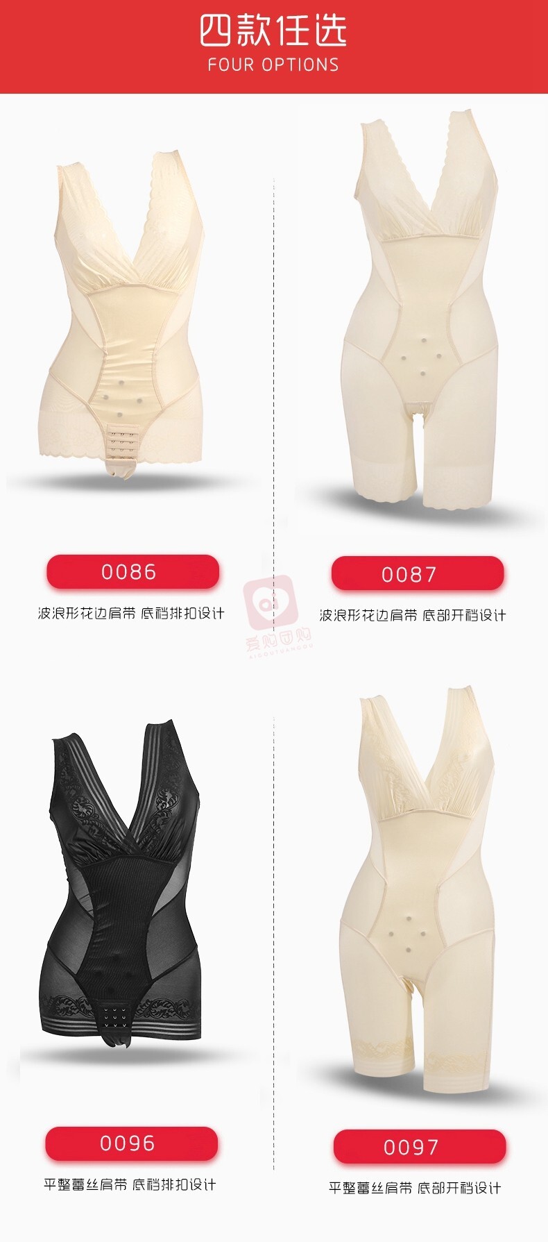 四款任選:①0086,波浪形花邊肩帶與褲腿,性感不失少女心。底襠排扣設計,可自行調節松緊度。②0087,波浪形花邊肩帶與褲腿,底部開襠設計,穿脫方便,性感撩人,穿上冷艷高貴。③0096,平整蕾絲肩帶與褲腿,底襠排扣設計,自由調節無束縛,展現深V魅惑。④0097,平整蕾絲肩帶與褲腿,底部開襠設計,方便穿脫,恢復迷人曲線。
