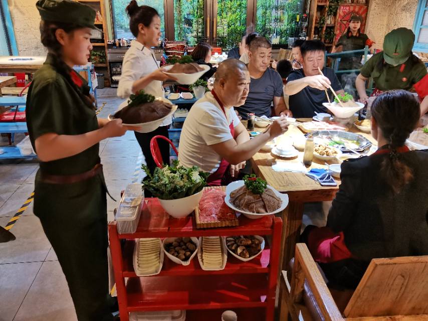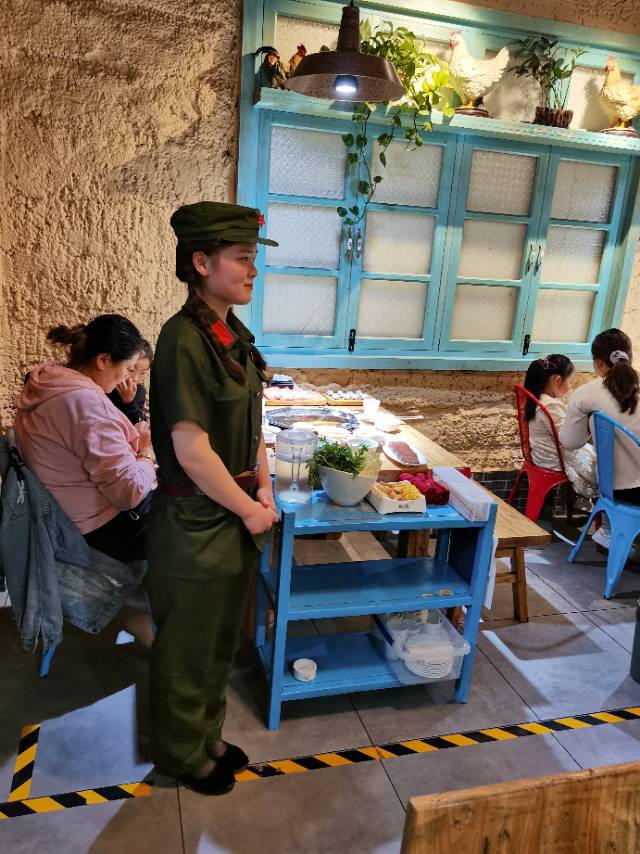 店里服務員的裝束也是很特別的,這是在人民公社的大食堂嗎?