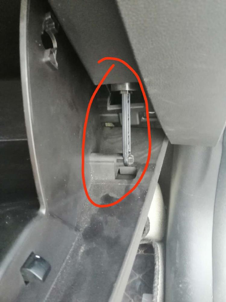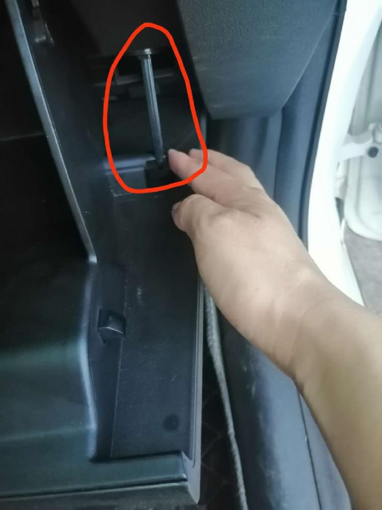 然后手套箱打開行程會變大一點,在手套箱右邊就可以看到一個阻尼桿,也是一個卡扣的,拆這個不能暴力,萬一弄壞了就得不償失了!(用手指頂住那個扣子,再轉動阻尼桿就可以很輕松的取掉了!)